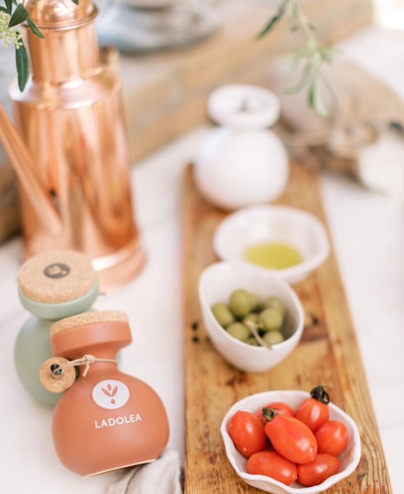 Twee keer pure Griekse smaak in één luxe set – Ladolea extra vierge olijfolie met chili en knoflook, in handgemaakte keramische potten.